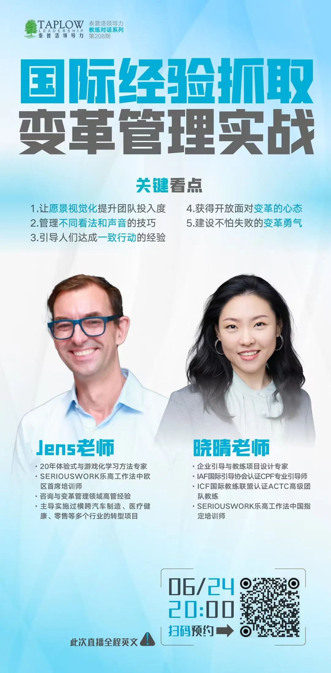 下周二晚8点,泰普洛领导力特邀国际变革管理实战专家Jens老师与本土引导教练专家晓晴老师联袂分享,萃取20年横跨多行业的转型精髓,直击变革管理核心痛点!
